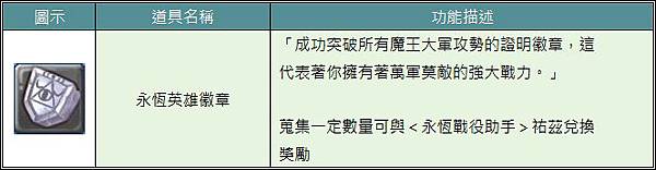 永恆之子,而秘密組織會依照成功挑戰的魔王大軍數量,在挑戰結束後獎勵大量的經驗值、職業經驗值,甚至能夠獲得「永恆英雄徽章」,繳交給特定的秘密組織成員就能獲得獎勵福袋,甚至是擁有強大力量的稀有稱號!